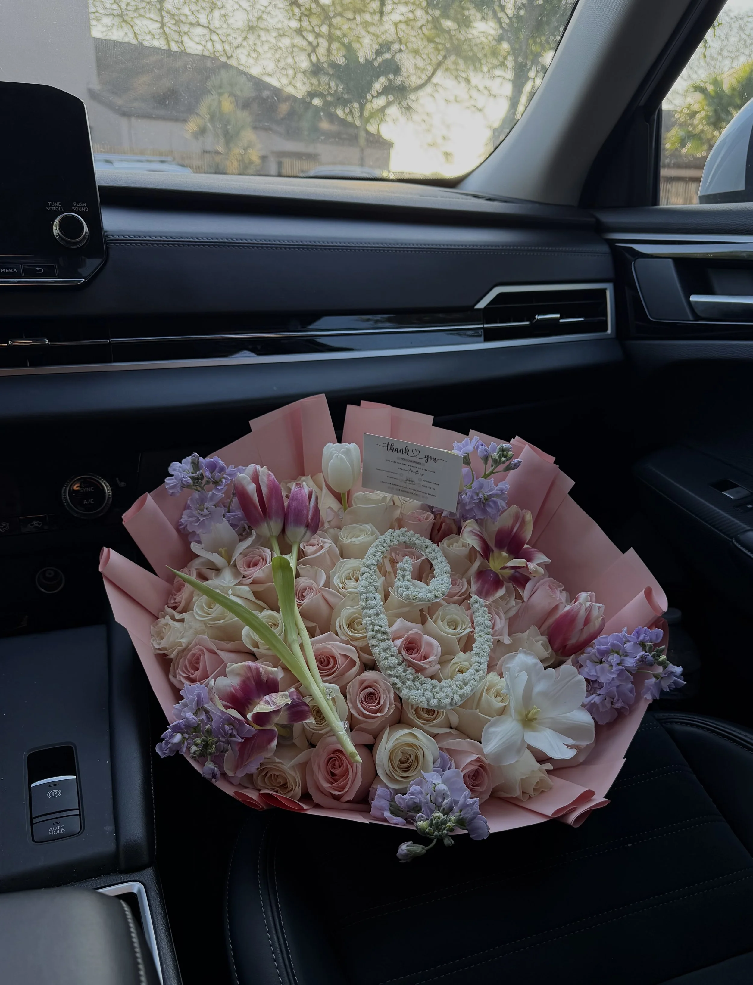A soft, romantic blend of 50 blush & ivory roses, statement lilies, delicate snapdragons, and fresh eucalyptus, all wrapped in waterproof luxury paper for an elevated finish. Please note: All orders must be placed at least 24 hours in advance to ensure availability and quality.